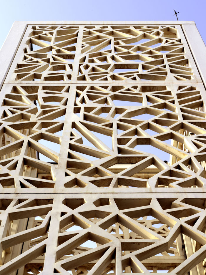 The ‘Ceremonial Entrance’ besides the Rem Koolhaas designed Qatar Foundation Headquarters building is a guard house re-imaged. The brief required a landmark gateway into the Qatar Foundation Campus as a strong statement of arrival whilst providing all the necessary advanced security features of a typical security checkpoint. The guardhouses have been integrated in three towering lighting structures framing the ceremonial entrance to the Campus. They are a ‘prelude’ and ‘ode’ to the Ceremonial Court featuring the intricate lattice work of their pergola structures designed by Arata Isozaki.